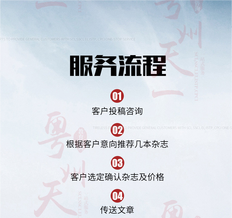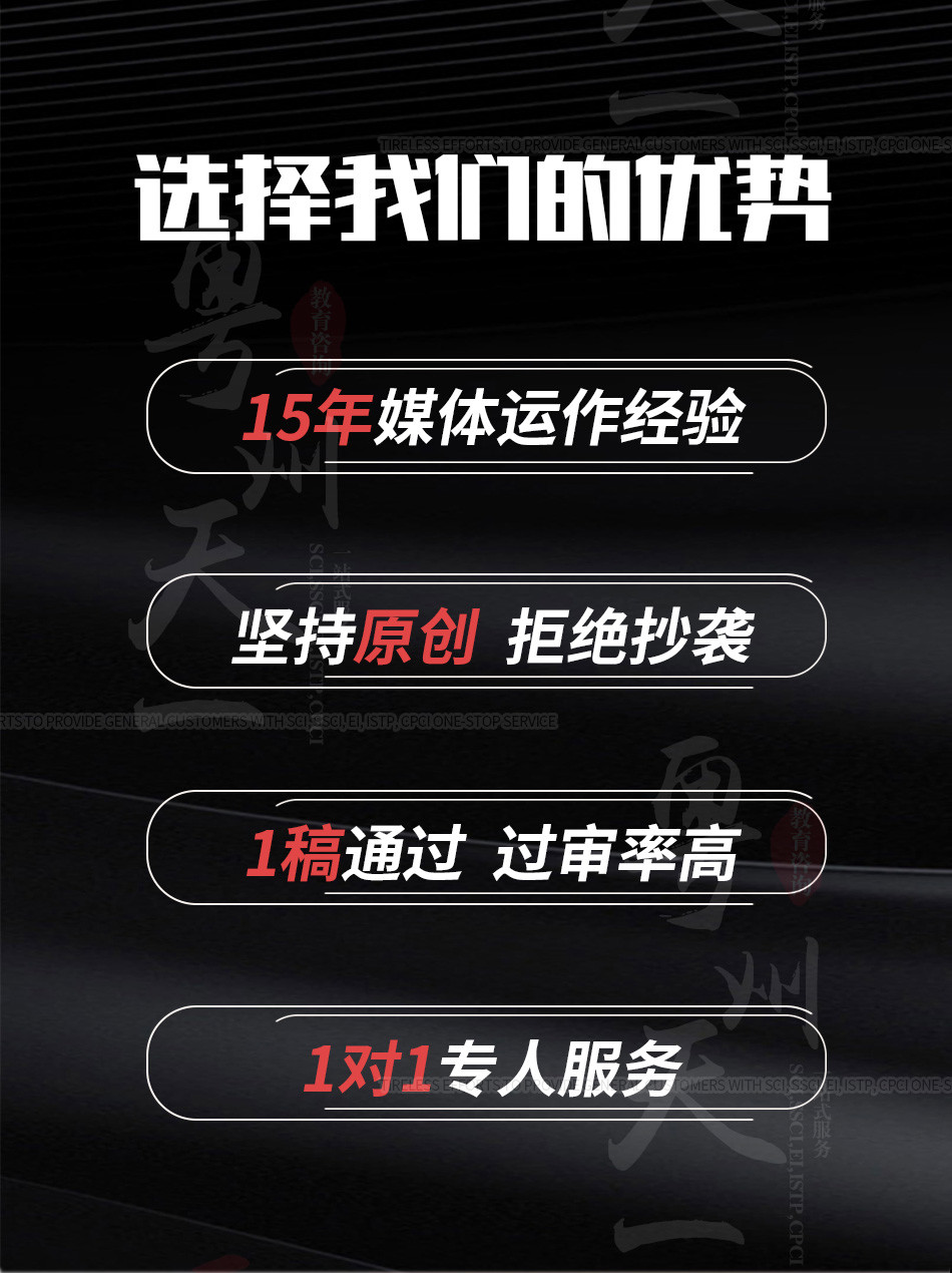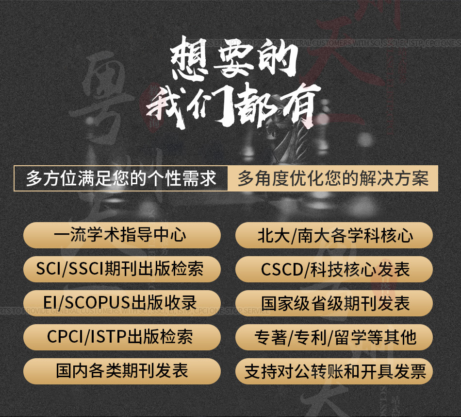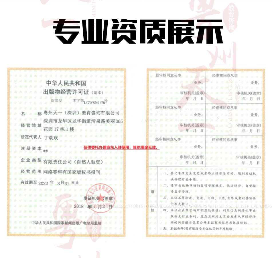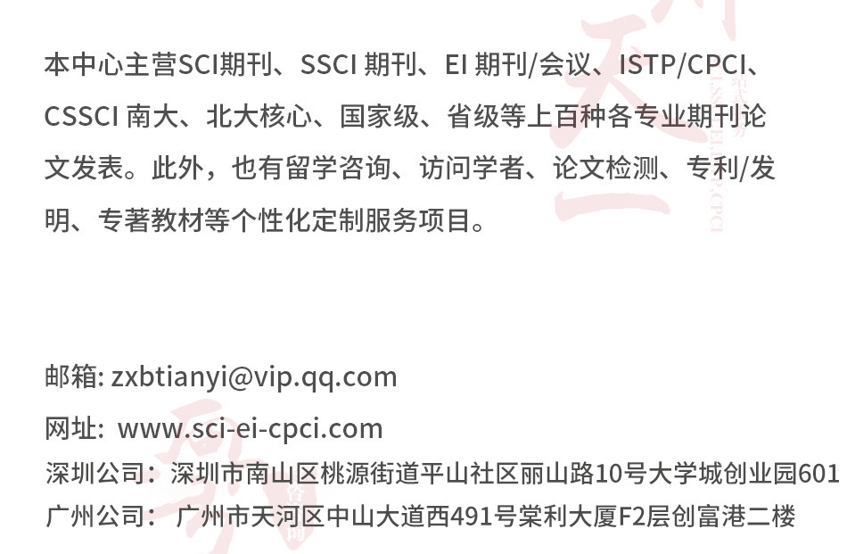 廣州愛燃知心教育咨詢有限公司在中國運營10餘年,本公司編輯 翻譯 推薦一體(tǐ)化的中介咨詢服務,其中網站(zhàn)內(nèi)期刊為(wèi)推薦報刊,僅供借鑒。公司擁有(yǒu)SCI,EI,ISTP檢索和(hé)北大(dà)核心、南大(dà)核心、CSCD及科技(jì)核心從期刊到會(huì)議的全門(mén)類核心檢索,包括從寫作(zuò)、翻譯到推薦發表一體(tǐ)化的中介服務,具有(yǒu)全世界一流的國際級采編教授團隊,歡迎各大(dà)院校(xiào)團體(tǐ)合作(zuò)。100%國際核心檢索。
