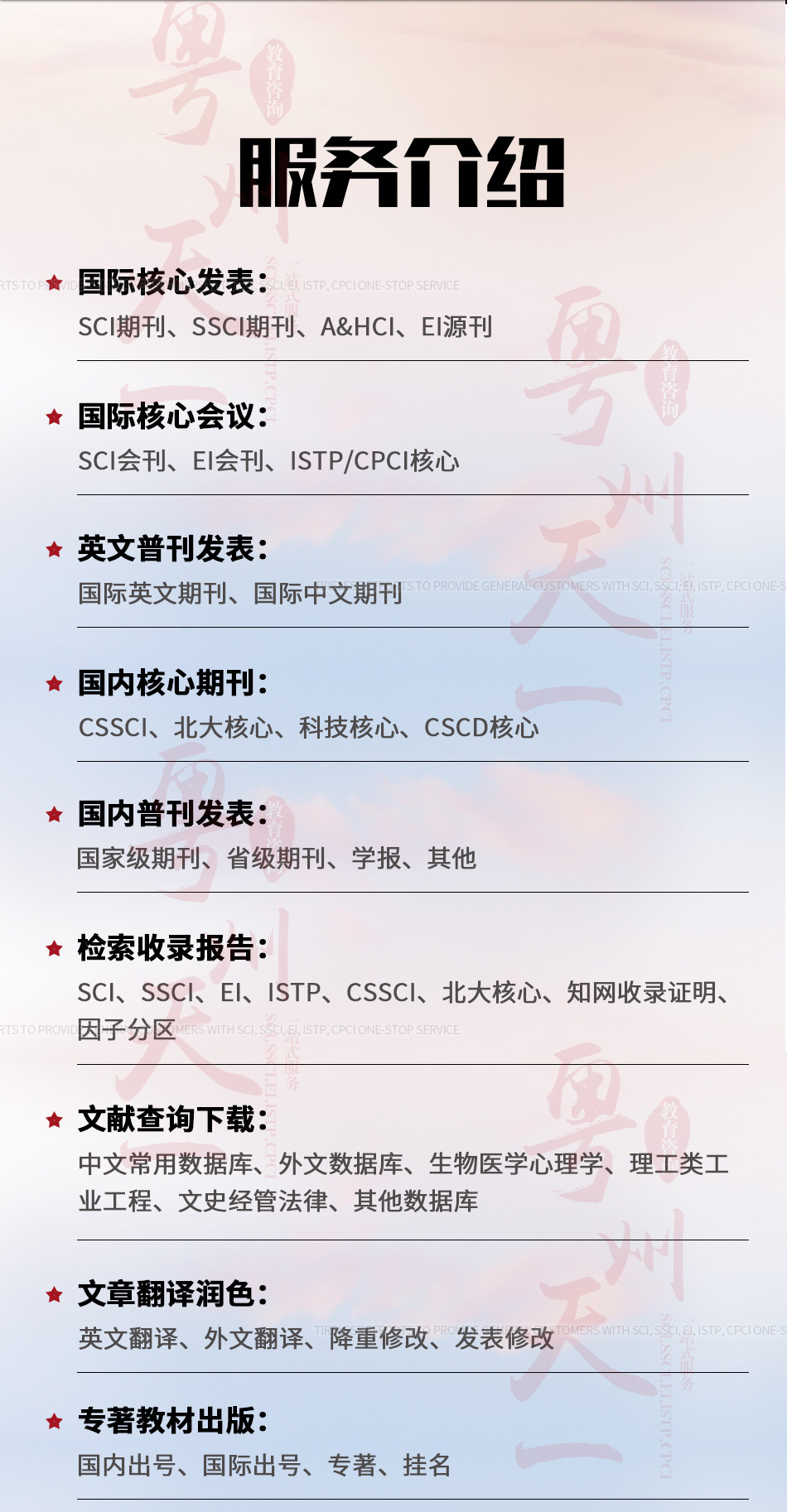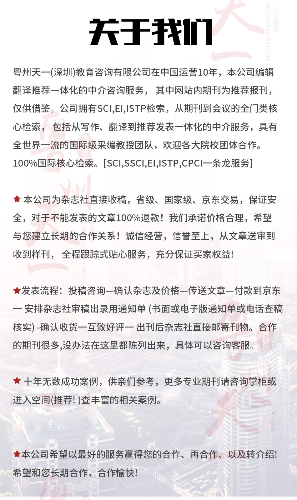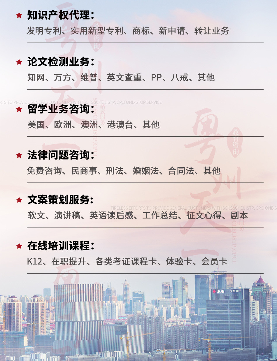 廣州愛燃知心教育咨詢有限公司在中國運營10餘年,本公司編輯 翻譯 推薦一體(tǐ)化的中介咨詢服務,其中網站(zhàn)內(nèi)期刊為(wèi)推薦報刊,僅供借鑒。公司擁有(yǒu)SCI,EI,ISTP檢索和(hé)北大(dà)核心、南大(dà)核心、CSCD及科技(jì)核心從期刊到會(huì)議的全門(mén)類核心檢索,包括從寫作(zuò)、翻譯到推薦發表一體(tǐ)化的中介服務,具有(yǒu)全世界一流的國際級采編教授團隊,歡迎各大(dà)院校(xiào)團體(tǐ)合作(zuò)。100%國際核心檢索。